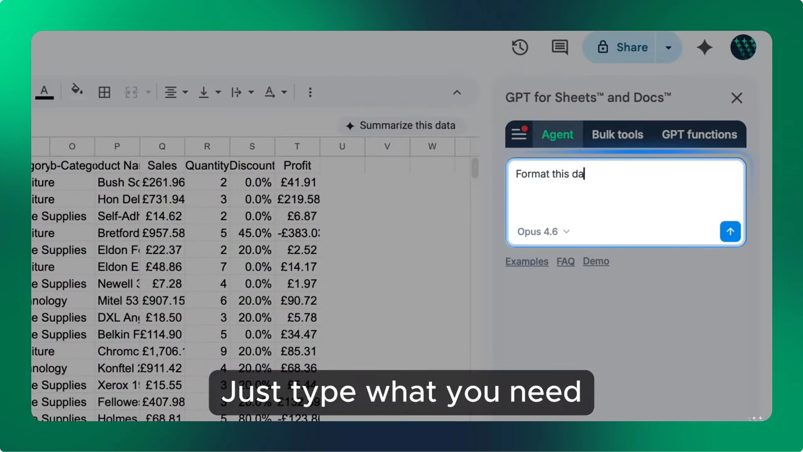 The agent reads your prompt, understands your spreadsheet, and executes directly in your file. Watch it happen in real time.