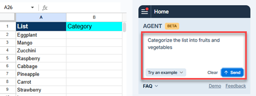 Describe what you need in natural language, and the Agent generates the appropriate Sheets formula, inserts it in the starting cell, and autofills the formula across the range.